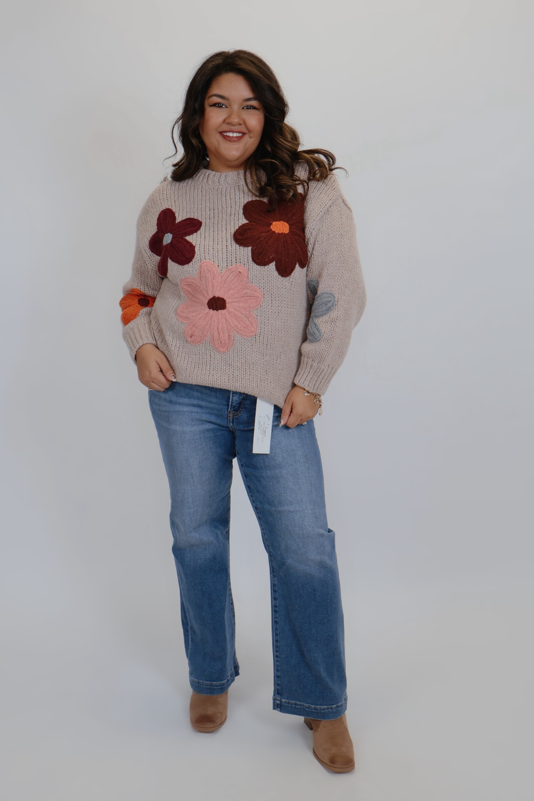 Weicher, hellbrauner Strick mit lebendigen, gestickten Blumen