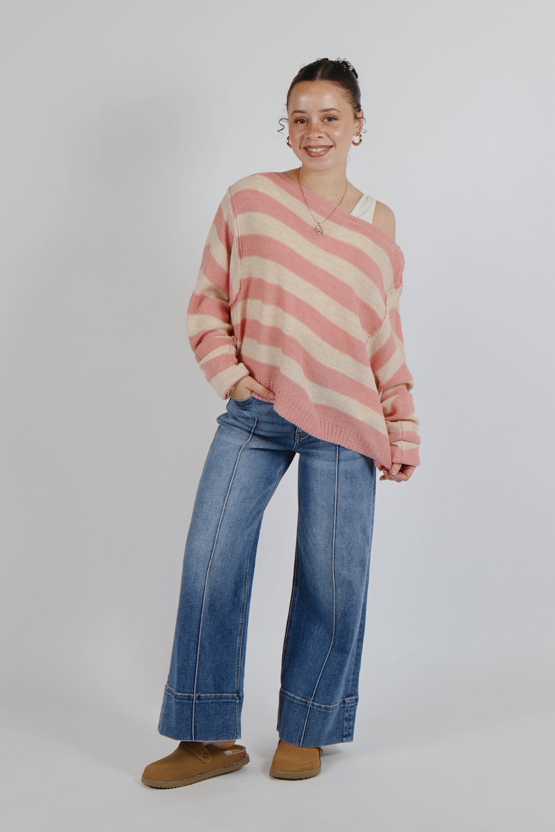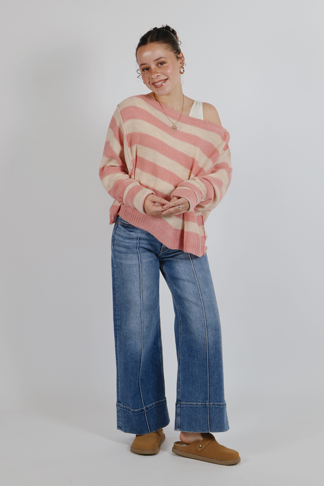 Weich, mühelos und perfekt lässig – der gestreifte Pullover „Blush Breeze“ mit U-Boot-Ausschnitt ist Ihr Lieblingsstück für einen gemütlichen Alltagslook. Mit seiner lockeren Passform mit überschnittenen Schultern und Dolmanärmeln fällt dieser Strickpullover wunderschön und sorgt für eine schmeichelhafte Silhouette. Der klassische U-Boot-Ausschnitt verleiht ihm eine feminine Note, während die sichtbaren Nähte und der Rippstrickabschluss für einen lässigen, bequemen Look sorgen. Der leichte Strickpullover in zarten, staubrosa Streifen ist perfekt für die Übergangszeit und lässt sich wunderbar mit anderen Kleidungsstücken kombinieren. Kombinieren Sie es mit Ihrer Lieblingsjeans für einen lässigen Boutique-Look, den Sie immer wieder tragen werden.