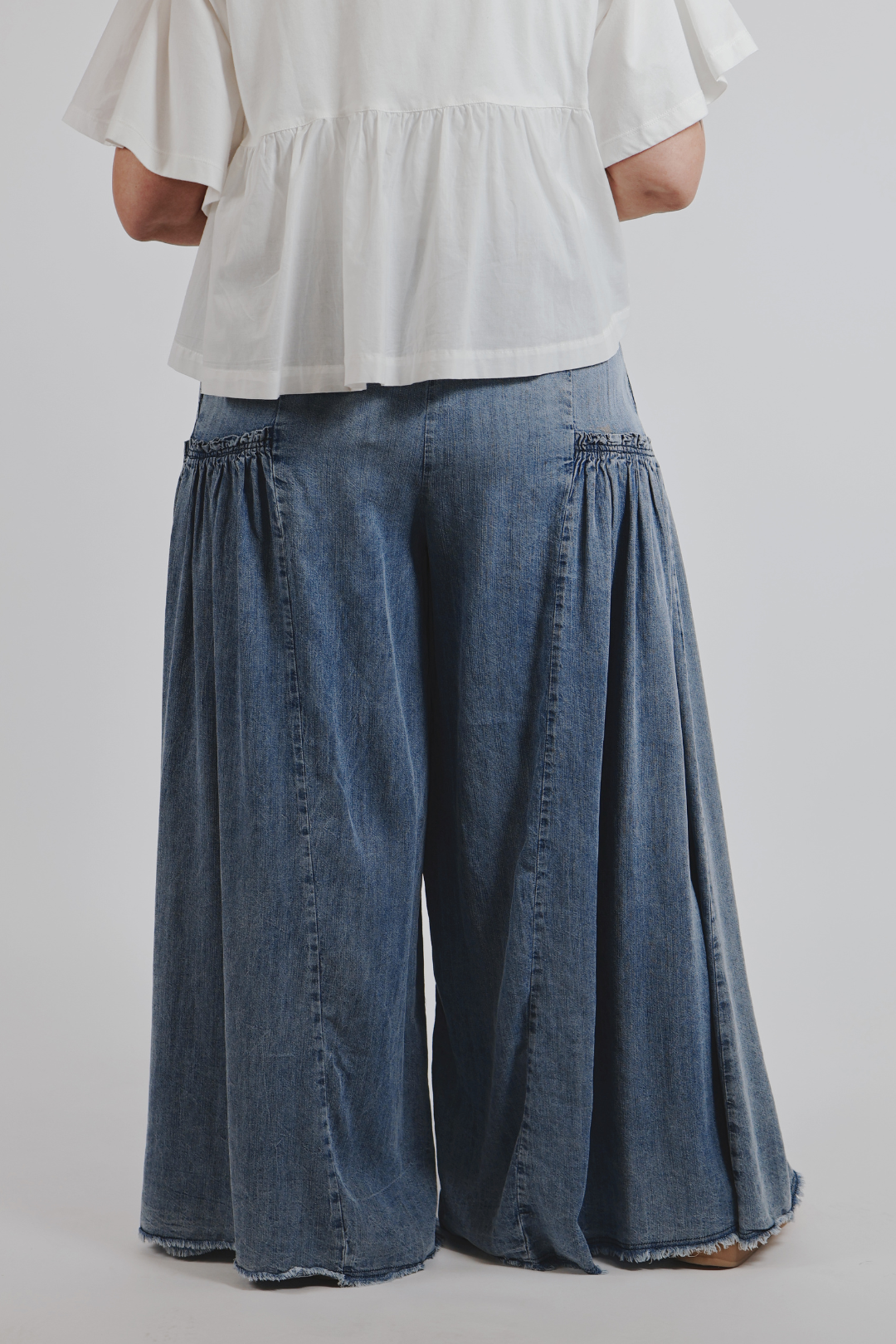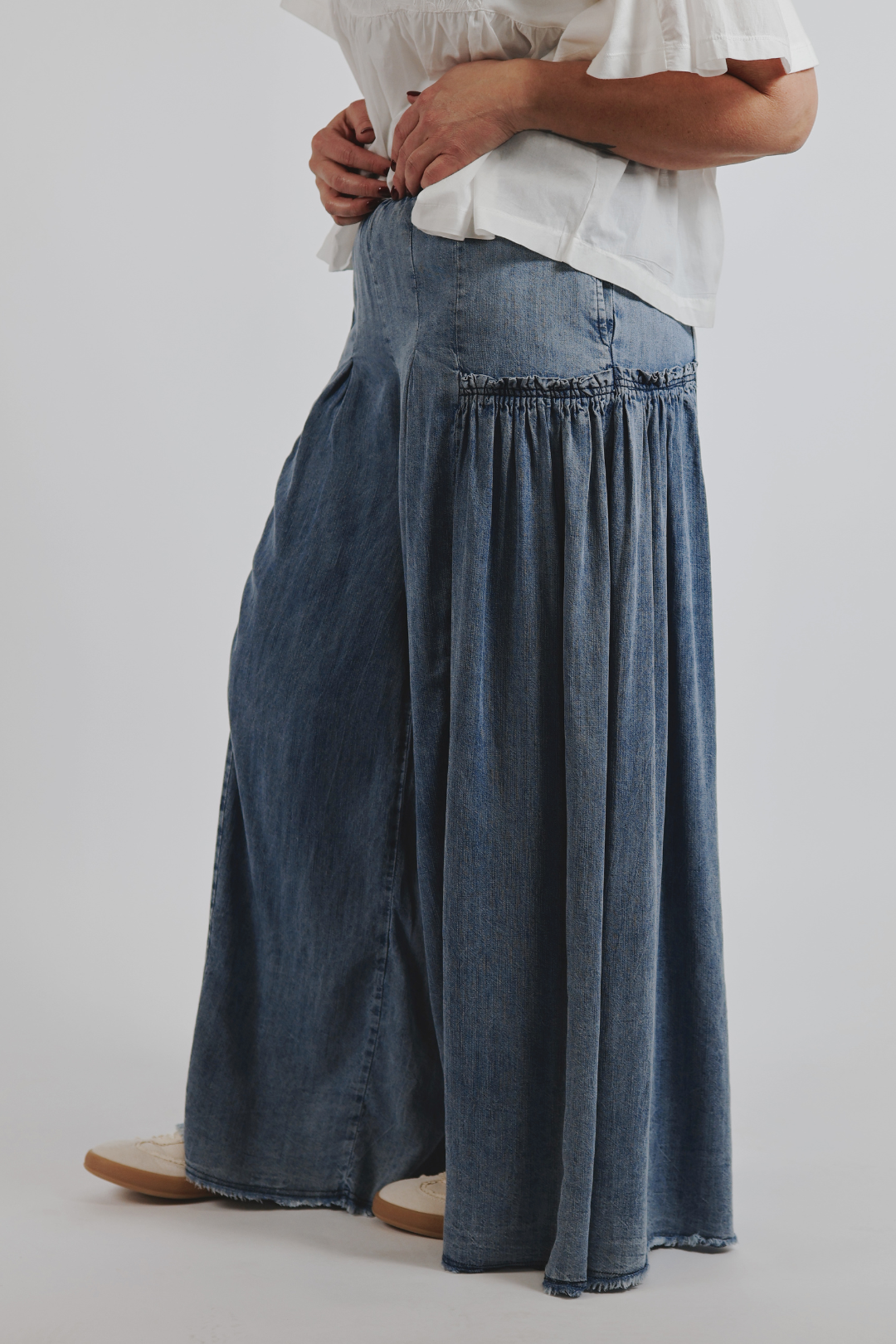 Entdecken Sie die weiche, fließende Hose, auf die Ihre Garderobe gewartet hat – die Dreamy Chambray Palazzo Hose. Gefertigt aus leichtem 100% Tencel Chambray, bietet diese Hose mit weitem Bein eine luftige, super bequeme Passform, die jede Bewegung mitmacht. Der elastische Bund sorgt für müheloses Tragen, während die Rüschen an den Seiten einen Hauch von Boho-Charme verleihen.