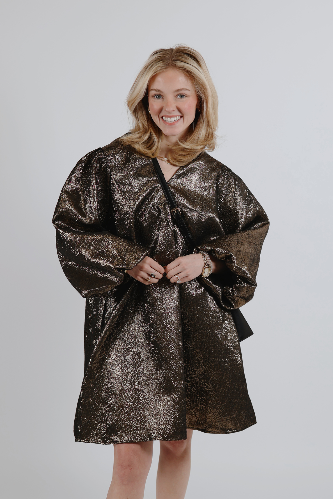 Mit diesem atemberaubenden Babydoll-Kleid mit Struktur ziehen Sie alle Blicke auf sich und lassen jeden festlichen Moment erstrahlen. Gefertigt aus einem luxuriösen, einfarbigen Stoff in Metallic-Optik, besticht dieses Kleid durch elegante 3/4-Ballonärmel und eine schmeichelhafte Babydoll-Silhouette, die Ihre Bewegungen wunderschön mitmacht. Der gerüschte V-Ausschnitt verleiht dem Kleid femininen Charme, während die Seitentaschen für praktischen Tragekomfort sorgen.