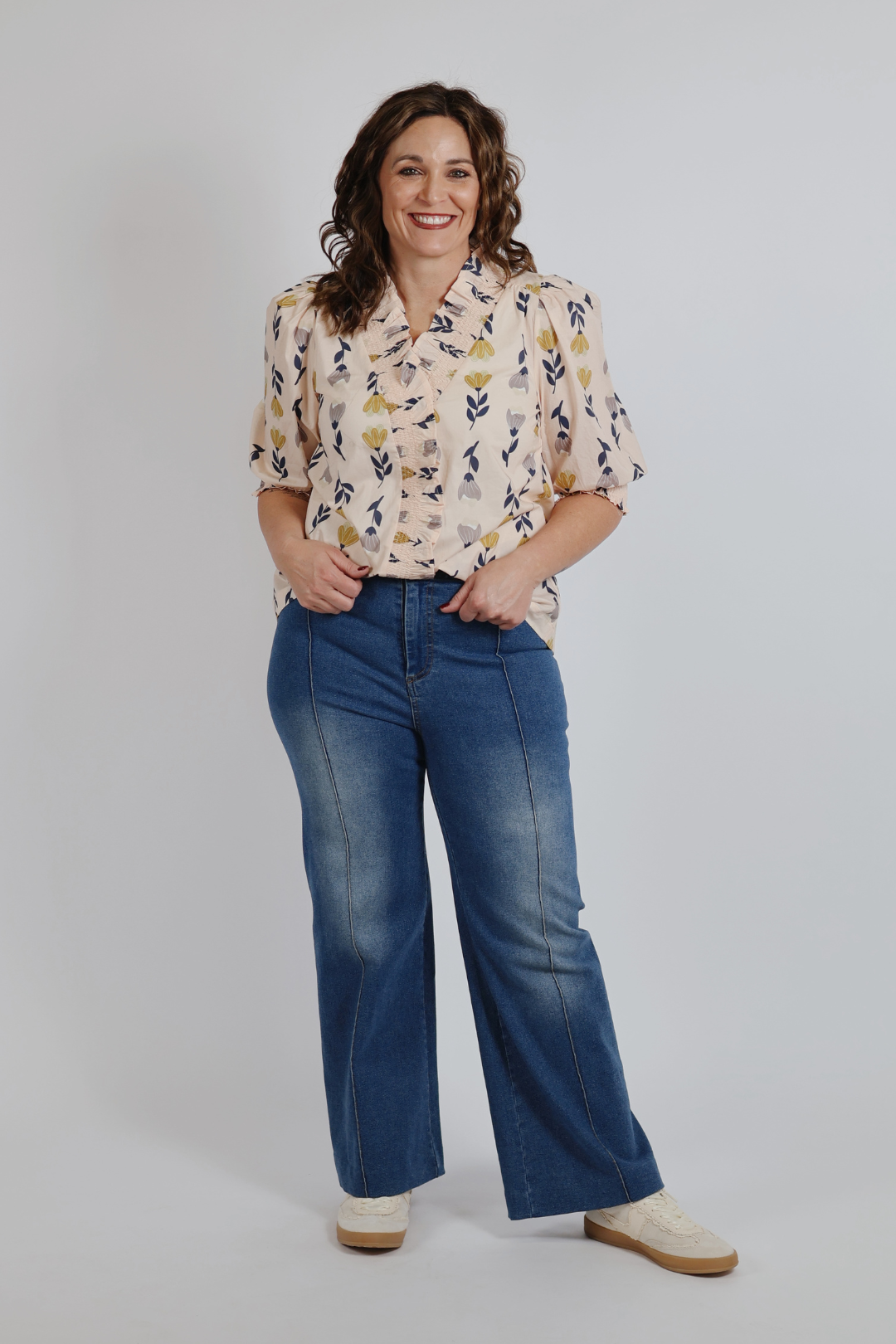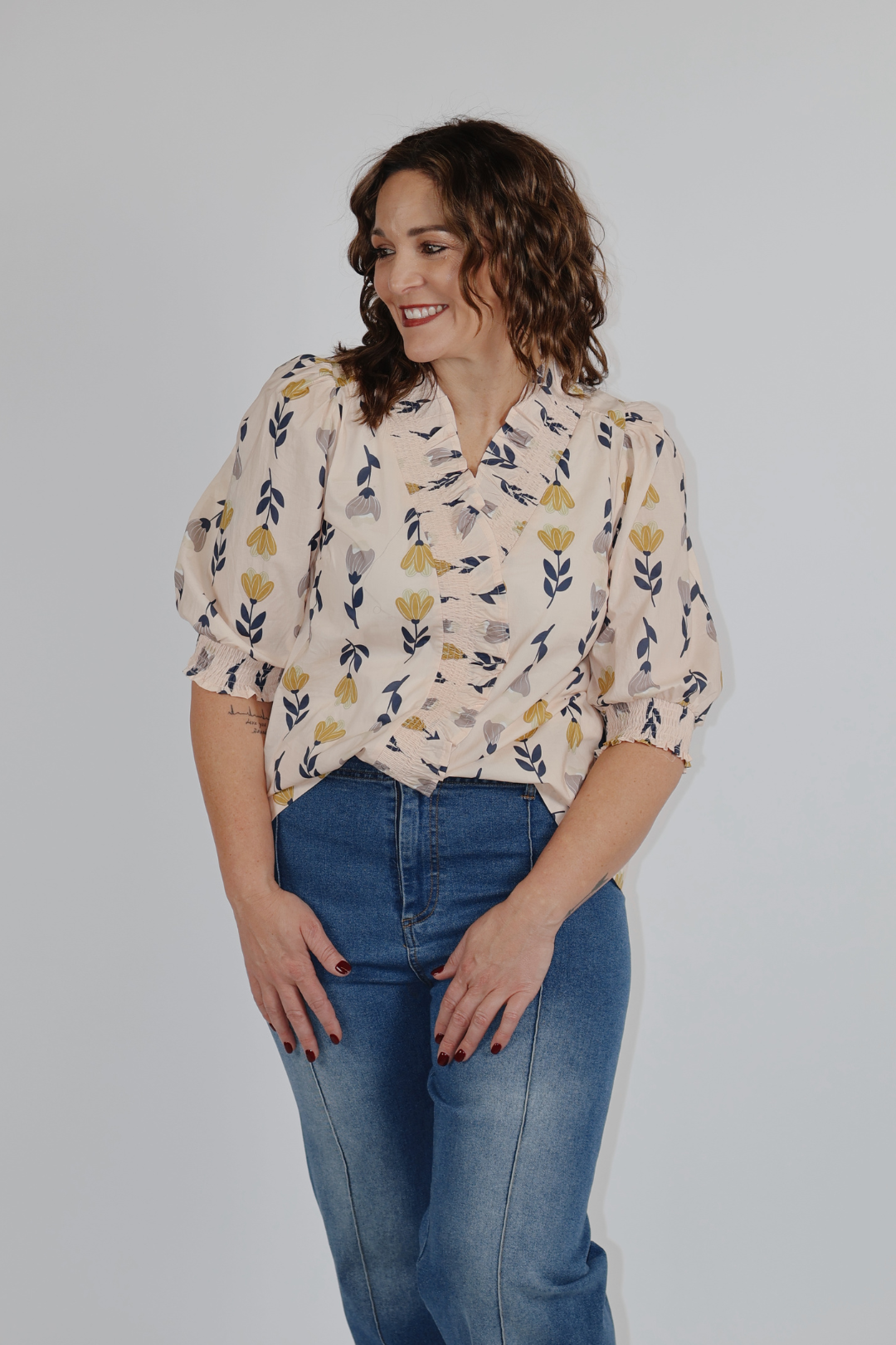 Romantisch und mühelos feminin: Unsere Rüschenbluse „Meadow Muse“ vereint Charme und Komfort perfekt. Die Bluse aus 100 % Baumwolle besticht durch einen zarten Blumendruck, einen schmeichelhaften V-Ausschnitt mit Rüschenbesatz und sanft gepuffte Ärmel für eine zeitlose, Boho-inspirierte Silhouette. Die gerüschte und gesmokte Knopfleiste verleiht dem Kleid eine charmante Textur und macht es vielseitig kombinierbar.