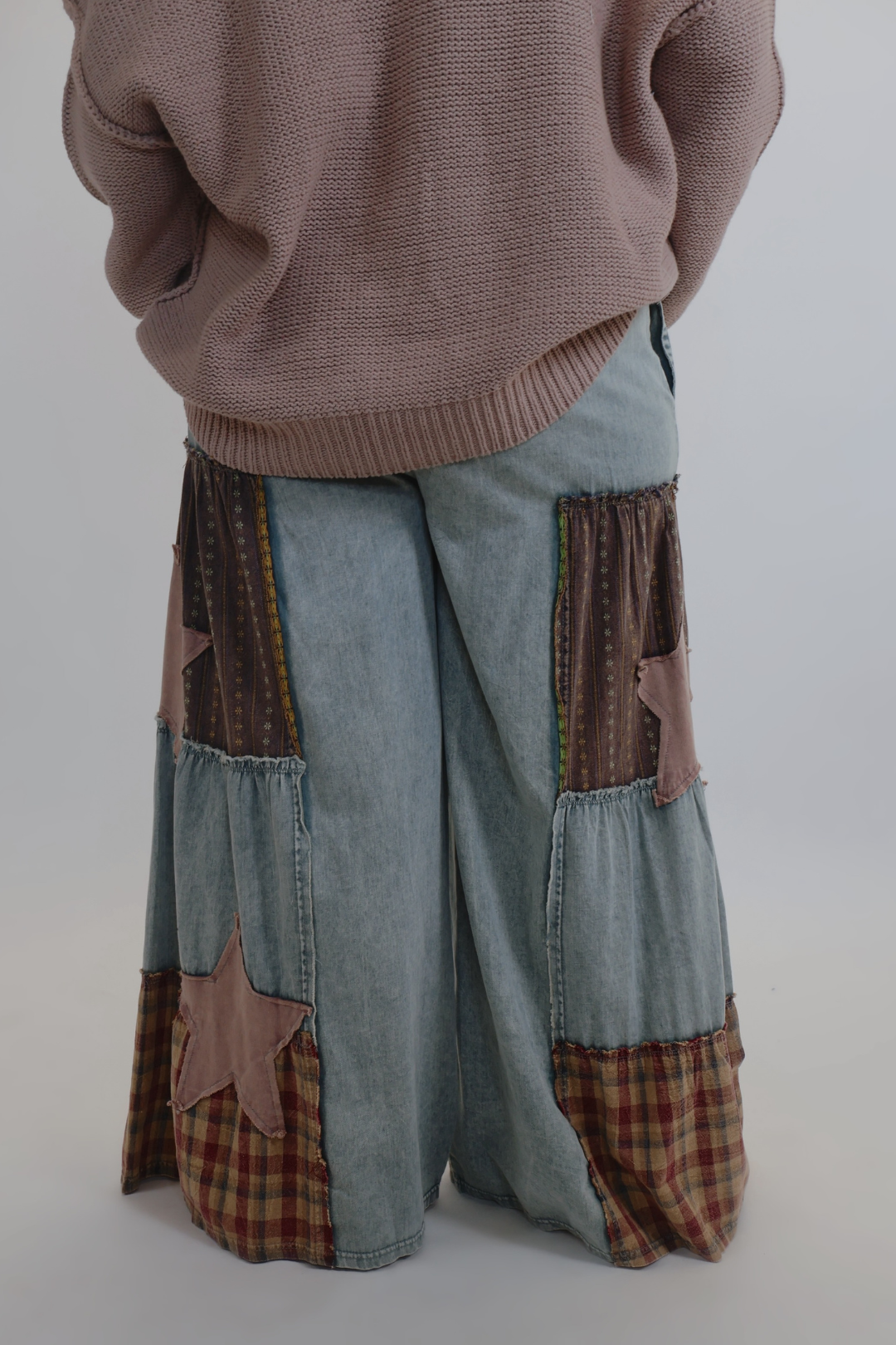 Entdecken Sie Ihr neues Lieblingsstück: die Stardust Patchwork-Hose – eine verspielte Mischung aus Boho-Charme, Vintage-Textur und mühelosem Tragekomfort. Diese weit geschnittene Hose ist aus weichem, mineralgewaschenem Chambray gefertigt und mit einzigartigen Patchwork-Stoffen, karierten Flanell-Akzenten und süßen sternförmigen Applikationen verziert, die jedem Schritt Persönlichkeit verleihen.