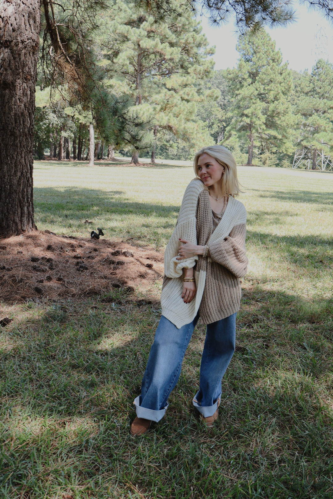 Hüllen Sie sich in den kuscheligen Charme des Weekend Wrap-Up Cardigans. Dieser grob gestrickte Cardigan mit offener Vorderseite besticht durch ein auffälliges zweifarbiges Color-Blocking-Design, eine lässige Passform mit überschnittenen Schultern und eine kuschelige, grobe Strickstruktur. Gerippte Bündchen an Ärmeln und Saum verleihen diesem mühelos bequemen Layering-Teil eine elegante Note. Perfekt für gemütliche Morgenstunden, kühle Abende und alles dazwischen.