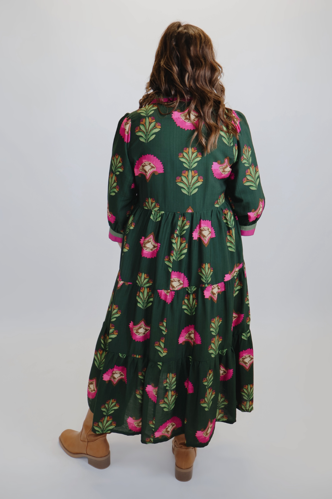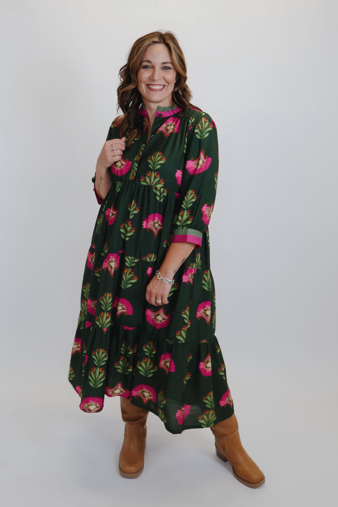 Das Kleid ist aus einem weichen und atmungsaktiven Viskose-Nylon-Gemisch gefertigt und hat eine schmeichelhafte, gestufte A-Linien-Silhouette, die bei jedem Schritt fließend ist. Der runde Ausschnitt ist mit einer dezenten Rüschenborte verziert, und die teilweise Knopfleiste mit goldfarbenen Knöpfen verleiht dem Kleid eine elegante Note. Mit 3/4-Ärmeln und lockerer Passform ist es perfekt zum Kombinieren oder solo tragen – saisonübergreifend.