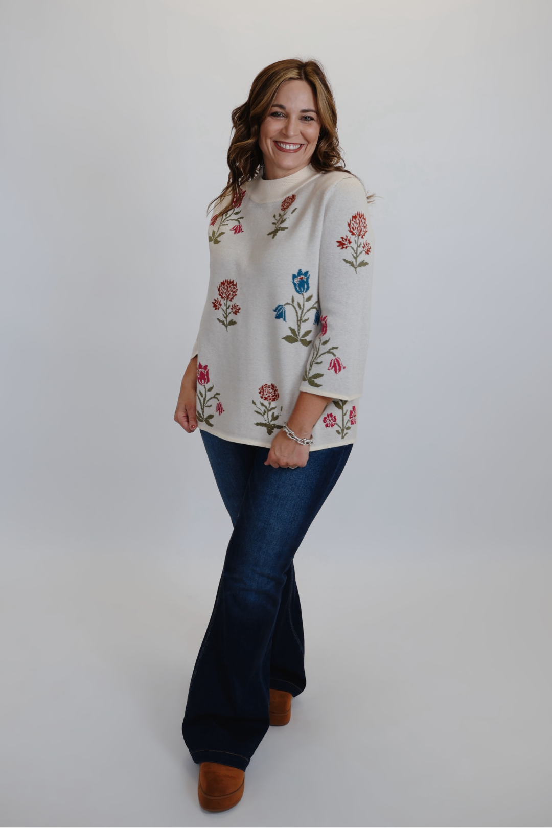 Verleihen Sie Ihrem Winter-Look mit dem Strickpullover „Winter Bloom“ in einem sanften Steinton das gewisse Etwas. Das auffällige Jacquard-Blumenmuster verleiht Ihrem Alltagsoutfit Charme und Eleganz. Dieser Pullover ist ein Must-have aus unserer Boutique-Kollektion und vereint Gemütlichkeit und Chic – perfekt für lässige und elegante Anlässe.